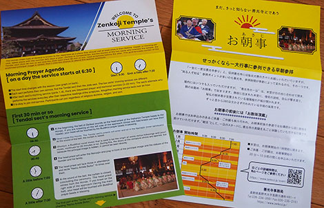 「お朝事」という、毎朝行われている「お数珠頂戴」などの参拝行事のパンフレットで、デザインは、お寺のパンフとしてはちょっと新しいポップな感じにしました。